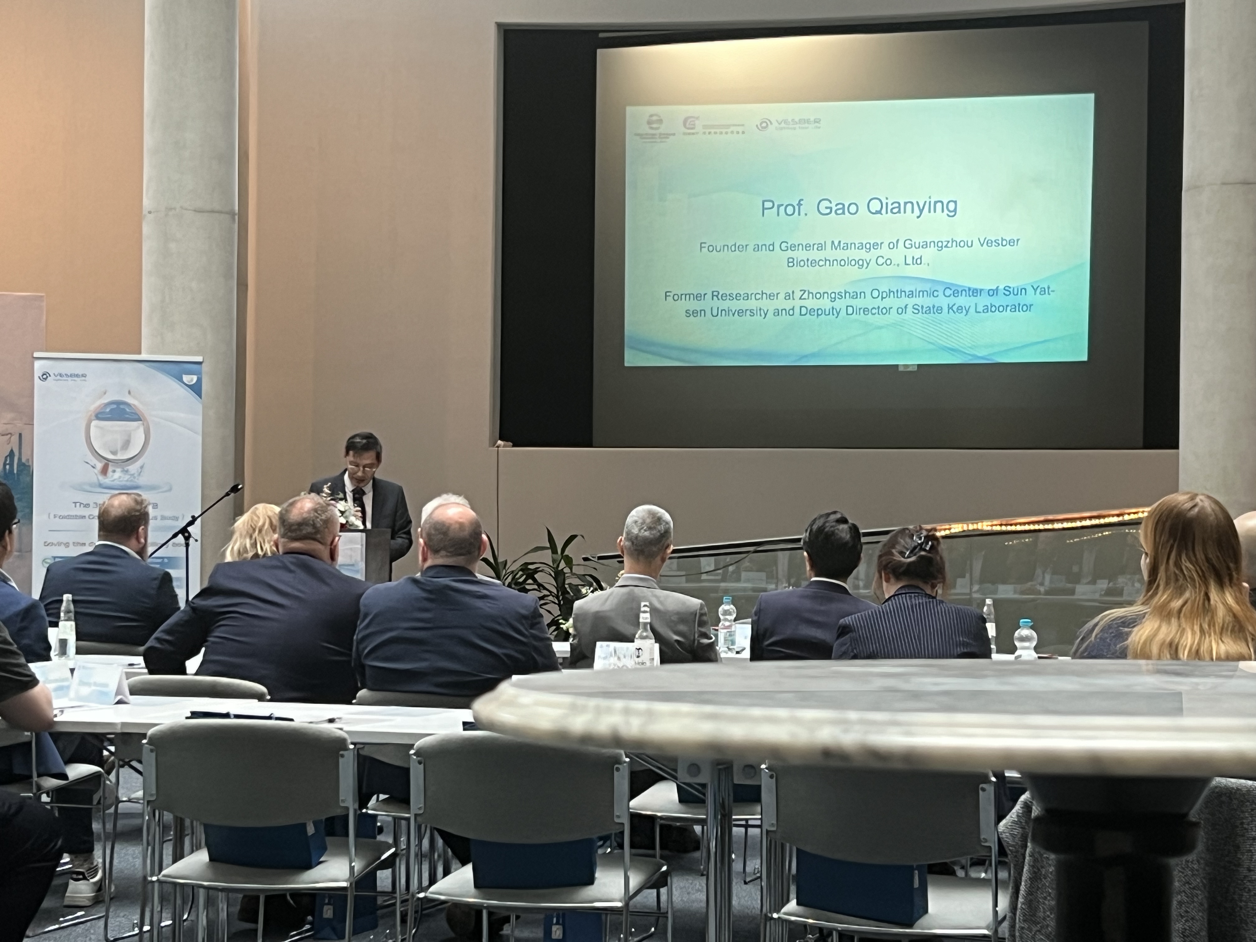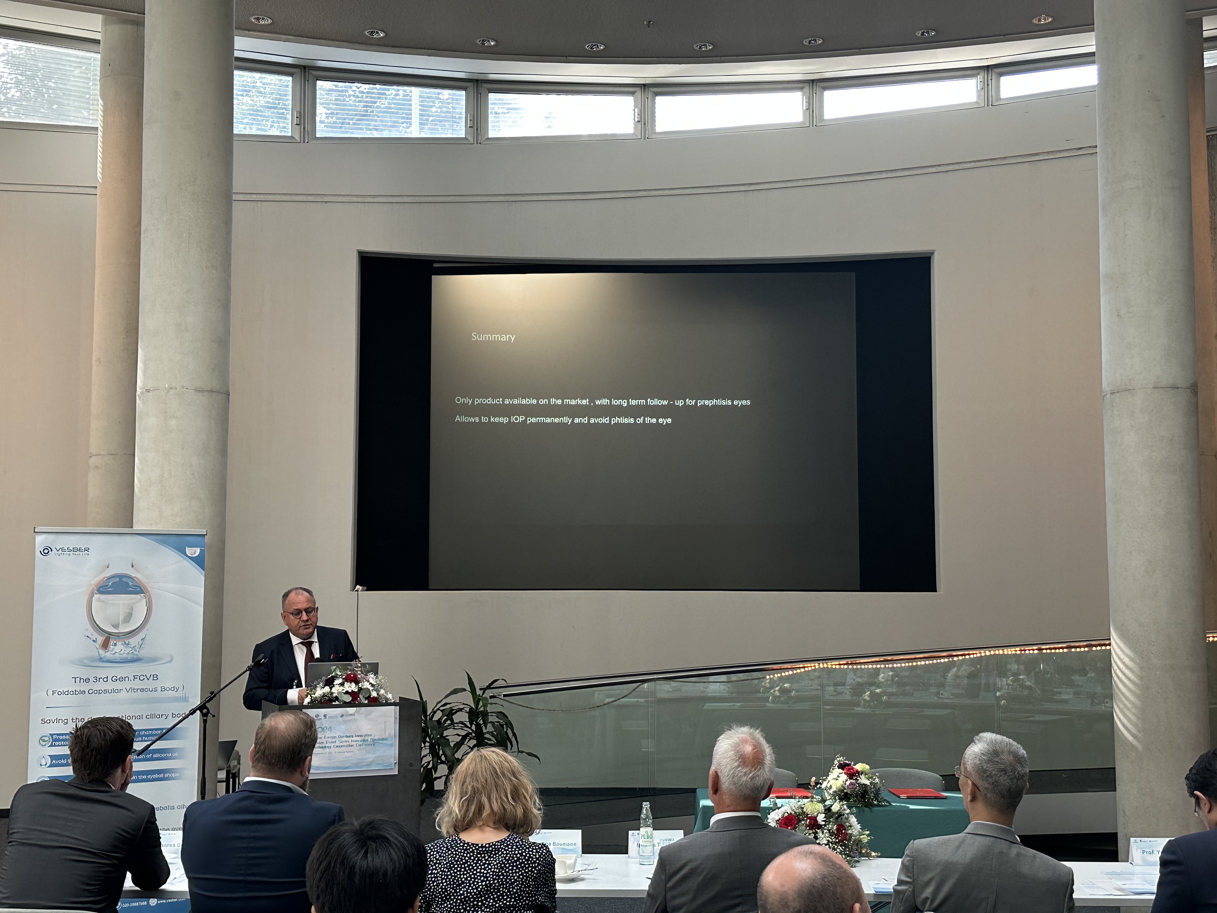 广州卫视博生物科技有限公司创始人兼总经理高前应向与会人员介绍了企业背景和代表产品。广州卫视博生物科技有限公司来自中国广东省广州市,是一家专注于眼科创新产品研发、生产和销售的中国高新技术企业,该公司研发的代表产品主要有折叠式人工玻璃体球囊FCVB)和折叠顶压球囊(FCB)。
